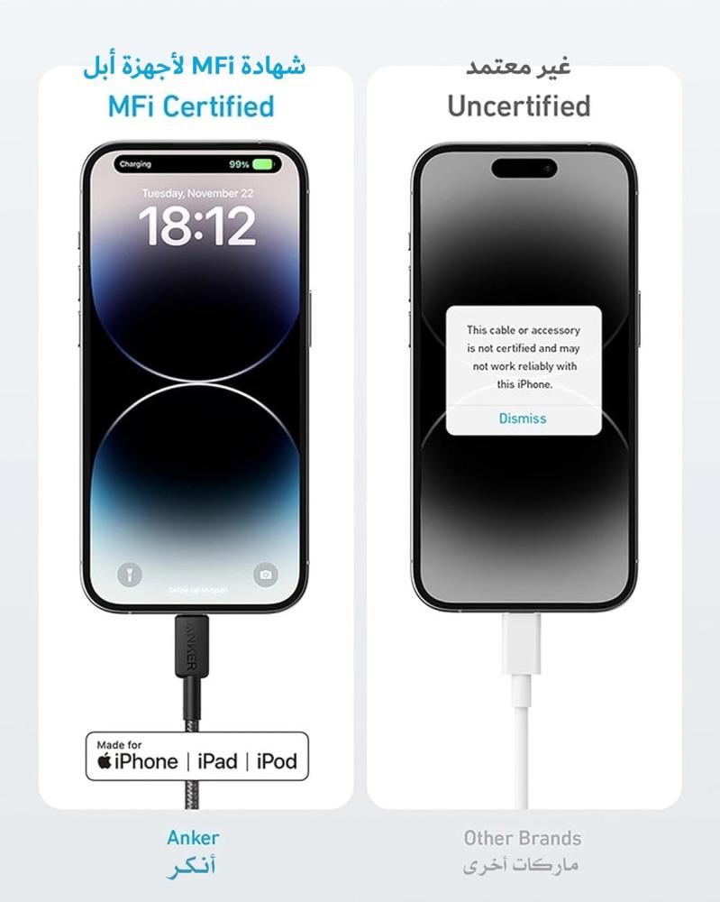 - الشحن السريع في كيبل ايفون من انكر وهو معتمد MFi من شركة ابل حيث تمكنك من شحن جهازك بأمان وبأعلى سرعة ممكنة عند توصيله بشاحن PD عالي السرعة.