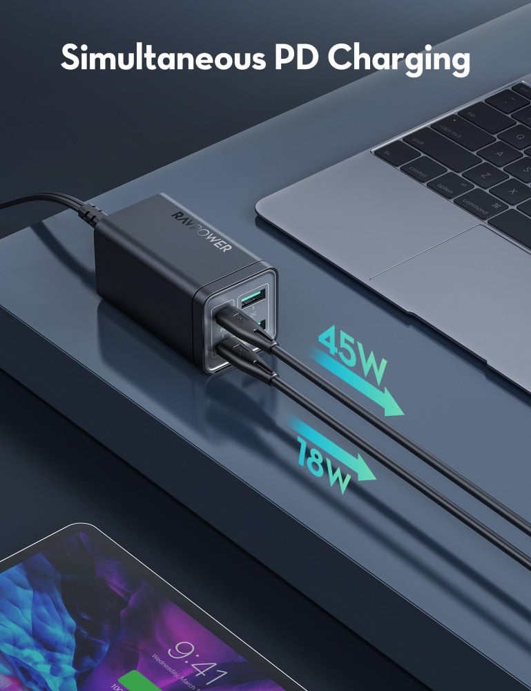 شاحن مكتبي من ماركة راف باور, يدعم الشحن السريع قدرة شحن كلية 65 واط أمكانية شحن 4 أجهزة في وقت واحد, منفذ شحن تايب سي عدد 2 بقدرة بقدرة شحن 65 وات بتصميم مميز وخفيف الوزن