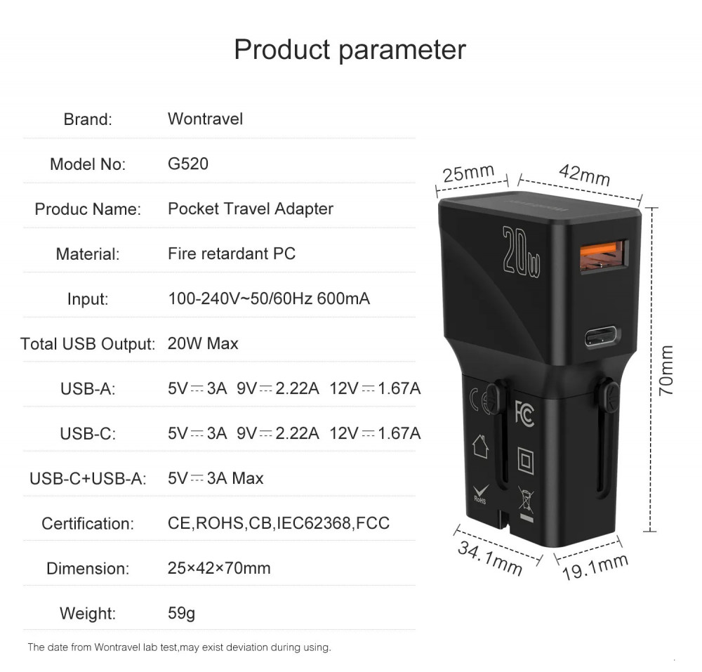 فيش شحن عالمي متميز من حيث الحجم والاداء مفيد في الترحال لان فيش عالمي متعدد الافياش حيث انها ياتي بحسب انظمة المناطق الاربعة العالمية وهي الولايات المتحدة وبريطانيا وأوروبا وأستراليا. كما أنه يحتوي على 1 منافذ USB بتقنية الكوالكوم 3.0 ومنفذ USB-C بتقنية PD بقوة 20 واط.