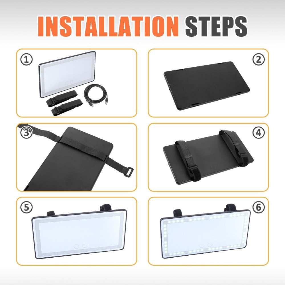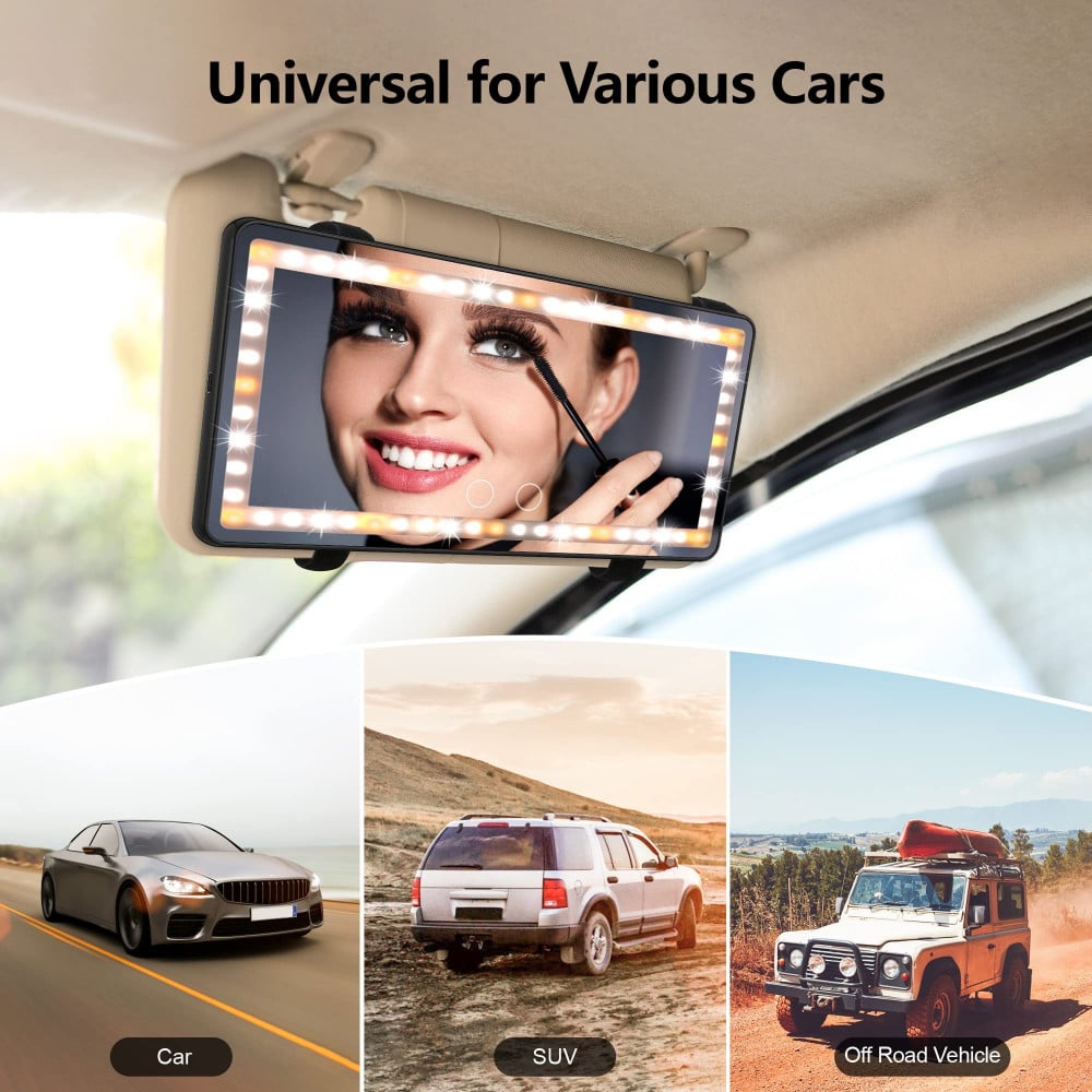 مرايا مع اضاءة للسيارة تعمل باللمس مع 3 درجات للاضاءة قابلة تعمل بالشحن تتميز بانها تحتوي على 48 ليد إضاءة لون ابيض و 12 إضاءة لون اصفر مع إمكانية تبديل درجة تباين الالوان (أبيض بارد ، أصفر دافئ)