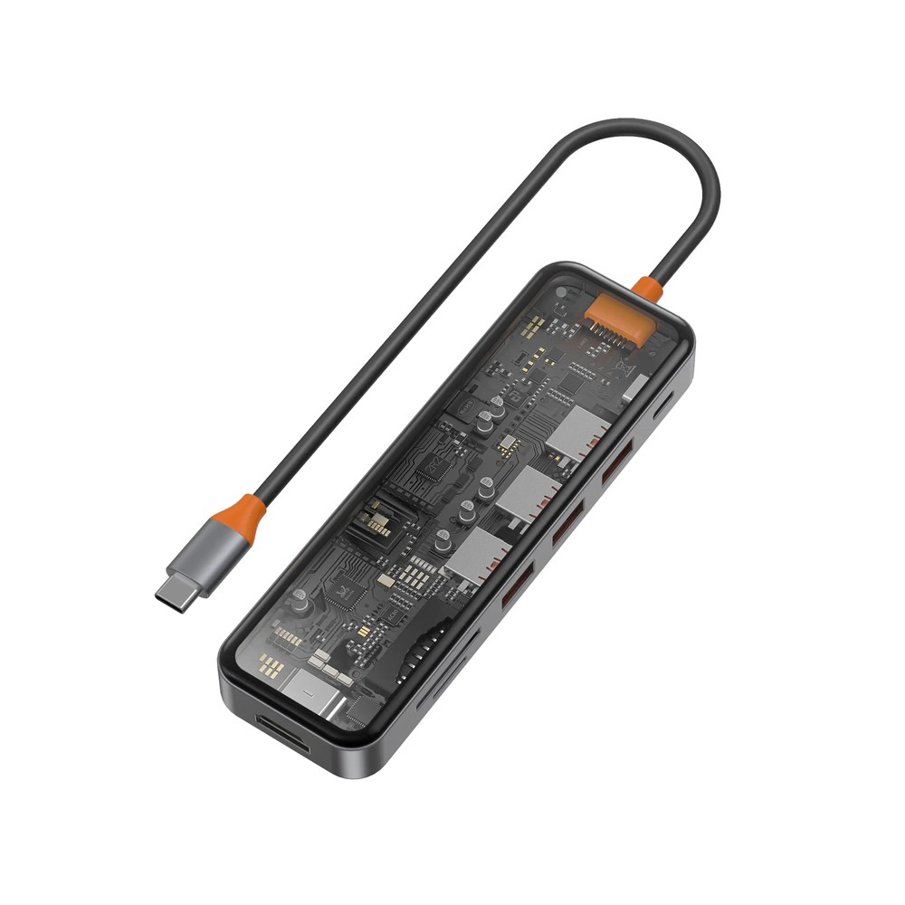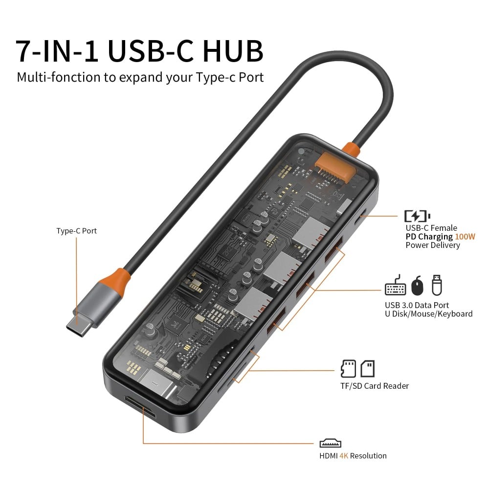 محول تايب سي سابير 7 في 1 موزع hub USB-C ماركة ويوو - رمادي شفاف